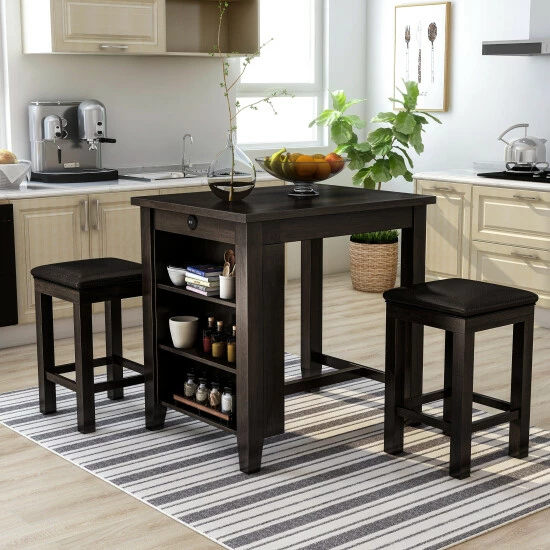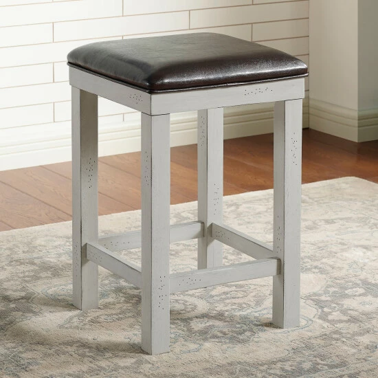Casual entertaining receives a stylish boost from the Lapp transitional three-piece transitional counter dining set by Furniture of America. This compact counter-height transitional set offers an aesthetic that’s both stylish and multi-functional, with an updated nod to farmhouse lore. A surprising and welcomed tech bonus offers a handy USB port built-in for easy access. Each piece of this set is crafted to showcase wood grain details over solid wood and wood veneer construction with a fresh finish. Enjoy convenient storage space in an open-end unit with two tiers of shelving that accommodate tall bottle storage on a bottom layer. Coordinating stools featuring deep brown faux leather padded seats and a classic linear silhouette.