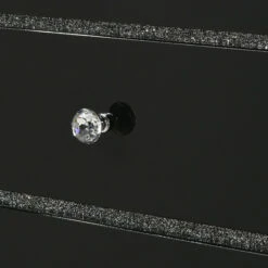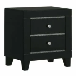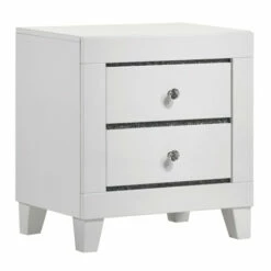 Sparkling details bring sophisticated presence to this contemporary two-drawer nightstand. A glossy finish gleams in the light while glittering details create an eye-catching but subtle statement piece. Crystal-like knobs add a refined finishing touch.