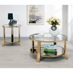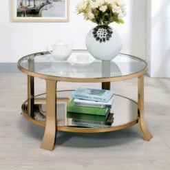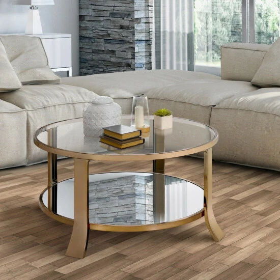 Take your living room to new levels with this chic, champagne finished coffee table. The contemporary metal structure showcases a round glass top, smoky mirror shelf, and lovely flared legs for a design that has real sophistication!