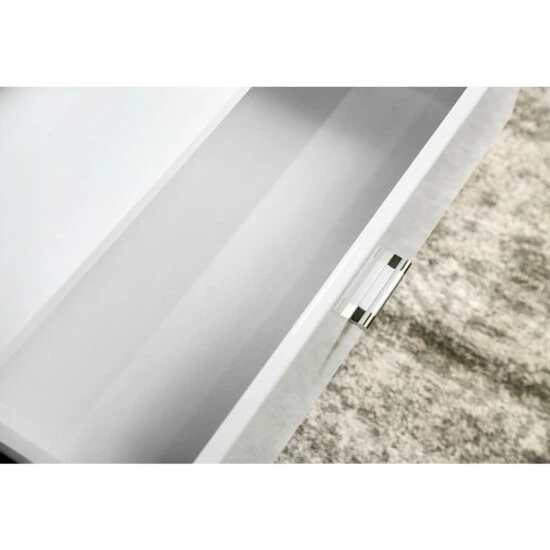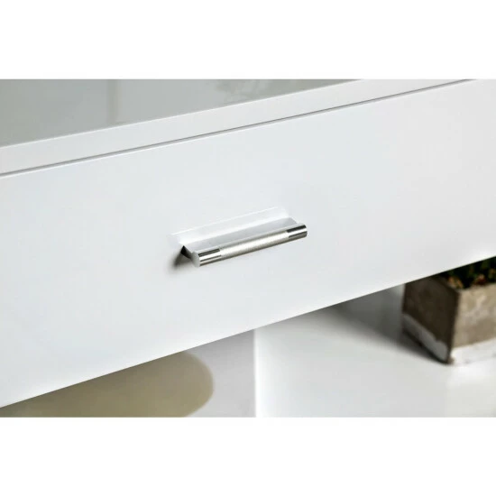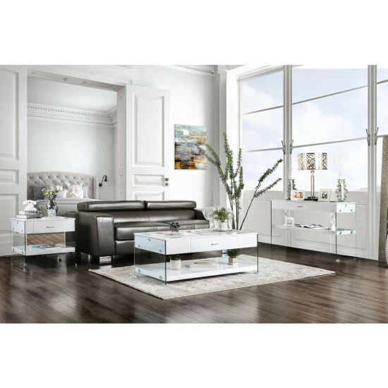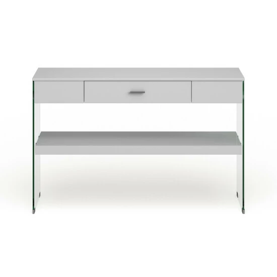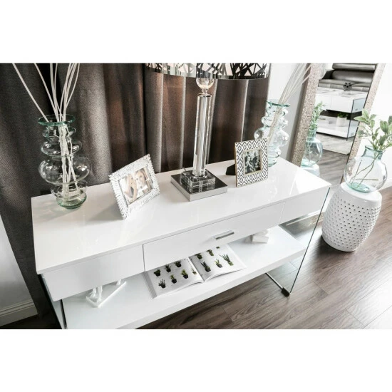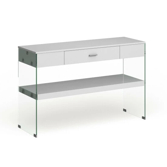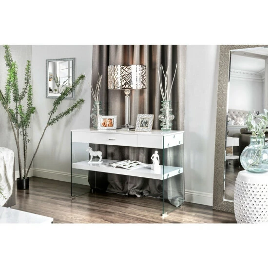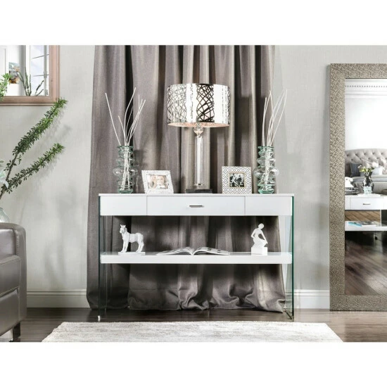 Sleek and sturdy, this modern, mixed material sofa table by Furniture of America will beautifully complement your contemporary decor. The chunky wood base includes a spacious open shelf and a single storage drawer on metal glides, giving you a variety of convenient options for storage and display. The wooden base is contrasted perfectly by sturdy, 10mm tempered glass legs that give it a chic and ultra-modern vibe with plenty of strength and stability. Silver tone accents add just enough polish to enliven the stylish design of this piece.
