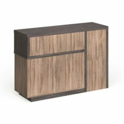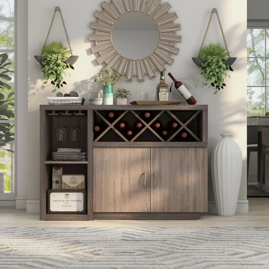 With a reliably rugged MDF and veneer construction, this glamorous, multifunctional server combines a weathered grey finish and a natural wood tone for a splash of juxtaposed vibes. Its two-door cabinet opens to four shelves within, as each door is adorned with a warmly toned pull that adds rich dimension.
