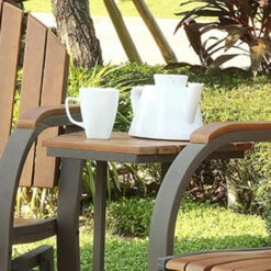 Enjoy the summer breeze with this inviting Mission style Liro Cottage Oak Three Piece Rocking Conversation Set from Furniture of America The smooth rocking mechanism creates a calm and relaxing seat while the spacious center table provides a perfect rest for drinks, snacks and more. Crafted from durable and weather resistant aluminum, this set completes any outdoor setting. The frame is finished in a matte sand black to accent the warm oak slatted seats and backs.