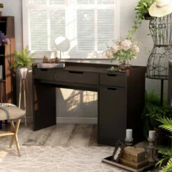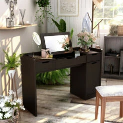 Simplify your morning routine with the Lity vanity from Furniture of America. The espresso-finished MDF and veneer frame offers a spacious tabletop, along with several drawers to easily organize your makeup and hair necessities. The flip-up tabletop comes complete with a mirror for added convenience.