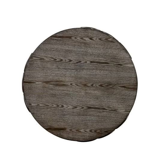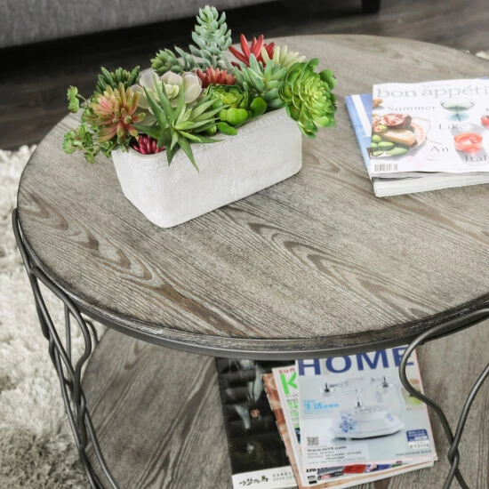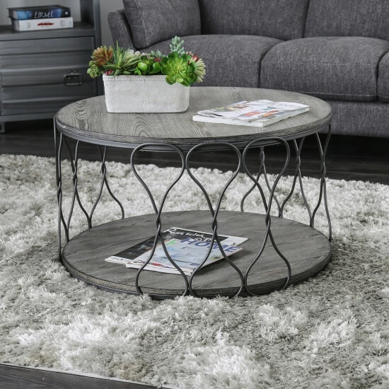 Add a touch of down to earth bohemian style to your environment with this striking metal and wood coffee table from Furniture of America. Lovingly made for the Lizi collection, the twisted metal frame has an almost handcrafted feel to it and complements the rustic weathered look of the lower shelf, providing the perfect place to display your favorite belongings along with the veneer tabletop. This is a wonderful round coffee table that features a stunning gray finish, giving it a spectacular industrial vibe with boho flair. Use this drum style coffee table to improve the appearance of your industrial or rustic living area.