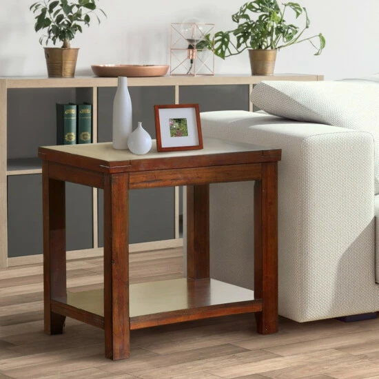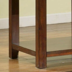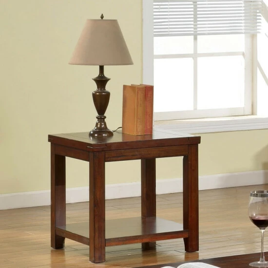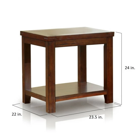 Bring a classic look to traditional spaces with the Llat cherry wood end table. This solid wood end table from Furniture of America adopts a classic silhouette and revs it up with a warm, beautiful finish. Choose this end table to tie together elements of a tasteful seating group in a laid back, livable space devoted to family and guest entertaining. Solid and sturdy, its wood and veneer construction looks and feels impressive. Minimalist design elements focus on symmetry and utility, with a spacious top surface offering ample space for lamps and decor. This classic end table is versatile and beautiful.