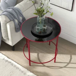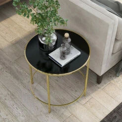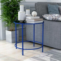 Unify a minimalist sitting area with the clean, classic silhouette of this contemporary glass side table. It boasts a round slab of black tempered glass that creates a touch of drama and sophistication in any space. Its thin framework delivers a drum-like profile while maintaining a delicate ambiance. Slender post legs complete this appealing look.