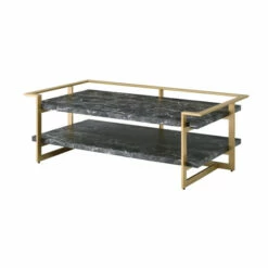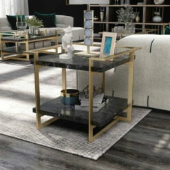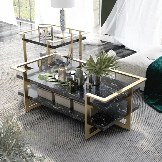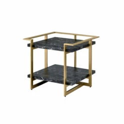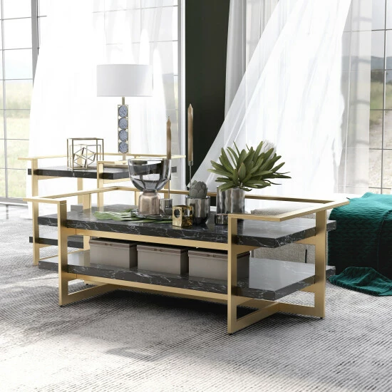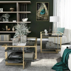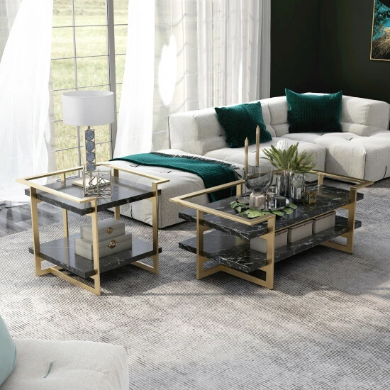 A cosmopolitan glam presents itself in this 2-piece set of accent tables. The gold-coated steel frames are a stylish look with cutting-edge precision. Their black faux marble tabletops and lower shelves nestle within the frame for classy taste.
