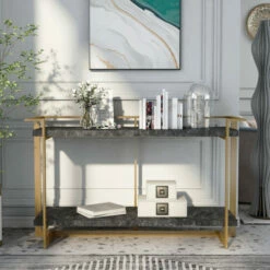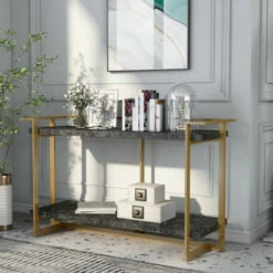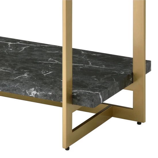 A cosmopolitan glam presents itself on this sofa table. The gold-coated steel frame is a stylish look with cutting-edge precision. Its black faux marble tabletop and lower shelf nestle within the frame for timeless beauty.