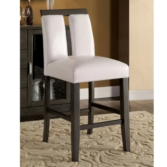 Upgrade the ambiance of your home with this set of two counter-height chairs. Each two-tone chair comes wrapped in white faux leather atop a cool grey frame. The split-back seat offers style to match the comfort of the thick cushions. The solid legs taper in the front and flare in the back, with handy footrests for convenience and comfort.