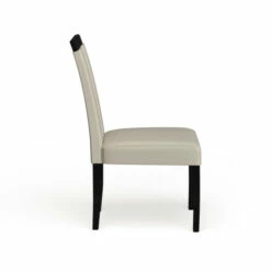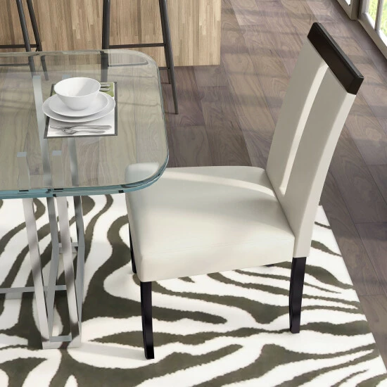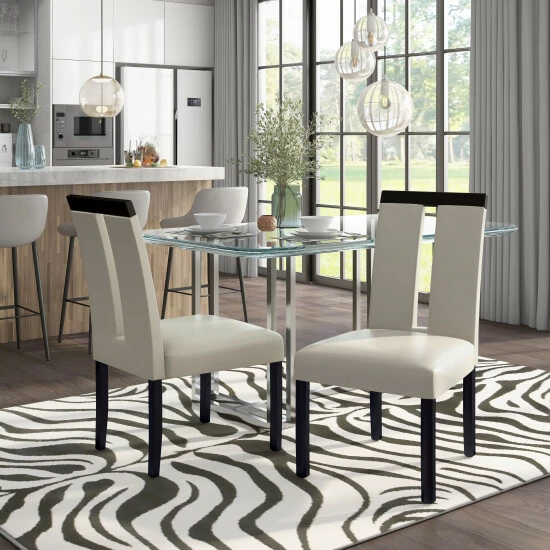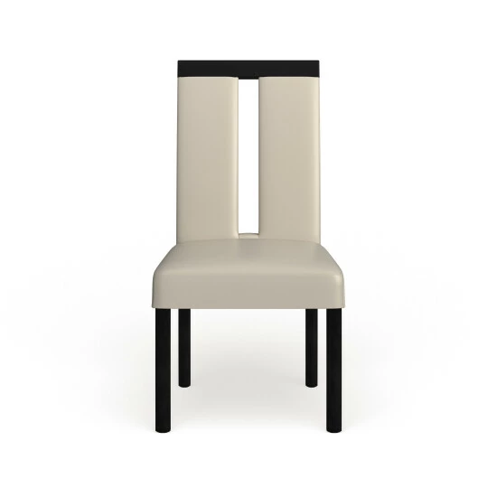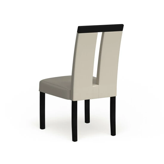 Give your modern home a jolt of energy with this set of 2 contemporary chairs from Furniture of America. Fashioned in a two-tone style that combines the contemporary with the comfortable, these versatile chairs bring a charming allure to any space. The solid wood frame comes in a timeless black finish, a delightful contrast to the plush padded seat and back that are wrapped in a brilliant white faux leather upholstery. Further allure comes in the form of the chic keyhole design of the seatback, as well as the tapered legs, which slightly flare in the back. These ultra modern chairs have a design and comfort perfect for any dining space, yet are versatile enough for use in a living room or entertainment area. Ivory white seat/back with espresso colored legs and top provides a two-tone contrast.