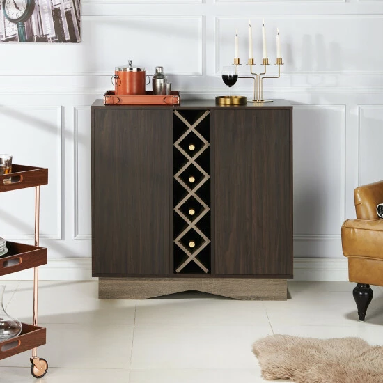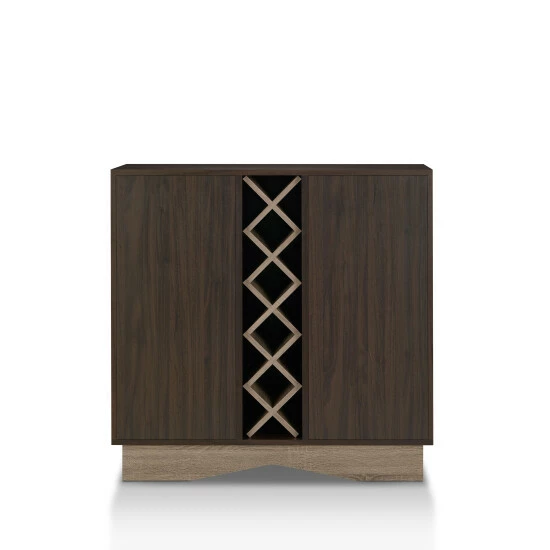 Store wine, glassware, and serveware neatly and conveniently in this Lymu wine cabinet, featuring 16 slots for wine bottles. Delivering on a contemporary aesthetic, this wine cabinet offers a rich wenge finish with a contrasting base in a lighter wood tone that lends a sense of lightness. The highlight of its design is a vertical center wine rack that’s created with five stacked X-frames that create storage for 16 of our favorite vintages. Flanking the win rack are two integrated cabinets with adjustable shelving that offers customized storage space for serveware, essentials, and accessories. The wide base lends stability while showing off an angular apron that adds contemporary appeal.