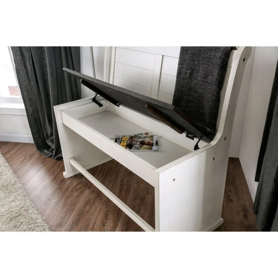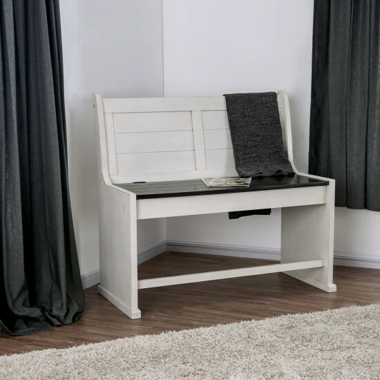 Turn your casual dining space into a cozy breakfast area nook with this counter height loveseat bench from the Mage collection by Furniture of America. With a country vibe, this dining bench features a two-tone design with white finish leg supports and plank style backrests, contrasted by an espresso wooden plank storage bench seat that lifts to store items beneath. This bench also has a charming picnic-style silhouette that you’ll appreciate for years and is perfectly suited for a rustic style dining area or modern farmhouse designed home. This bench also works nicely within an entryway foyer as a place to rest while you remove shoes and outdoor apparel.