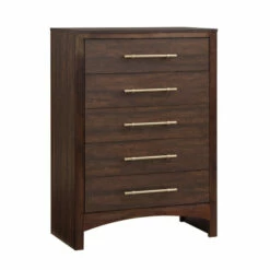 An arched apron delivers a touch of timeless character to this five-drawer tall dresser. Perfect for a traditional bedroom, the chest includes a rich walnut finish complete with classic details. Gold-coated bar handles decorate the drawers and add warmth.