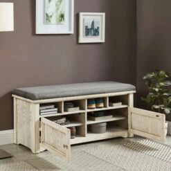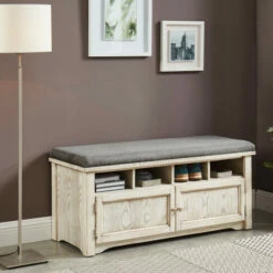A classic design benefits transitional spaces as it provides a perfect venue for organizing shoes, books, and other incidentals. The Mals two-door storage bench reflects a country-style look with updated accents providing a ton of design versatility. Made from wood and veneers, this cabinet unit from Furniture of America offers four open compartments that house items within easy reach. Two recessed-front cabinet doors conceal four shelves areas for protective purposes and hiding incidentals. Sit comfortably on a top surface with thick padding wrapped in soft fabric upholstery. In a mudroom, entryway, or main living area, this elegant cabinet is the star of the show with a blend of utility and fashion. Available in two distinct finishes to customize your interior palette.