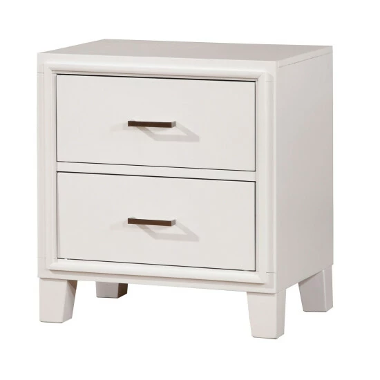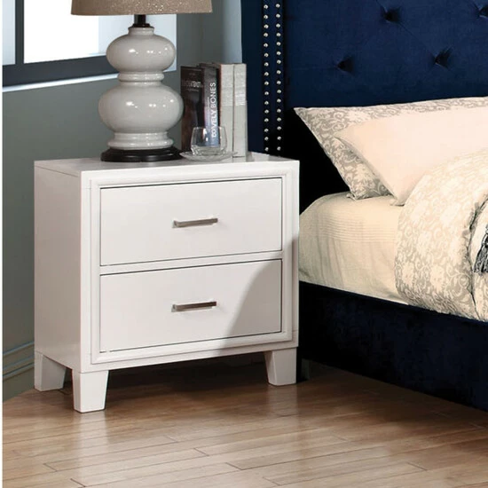 This contemporary, two-drawer Malt nightstand from Furniture of America makes a mark in your sleeping space. This piece is finished in stunning white color for chic style and two spacious drawers to help organize your space. This piece is supported on tapered legs and constructed with clean and sleek lines, giving it a simple silhouette that provides it with a modern and contemporary appearance.