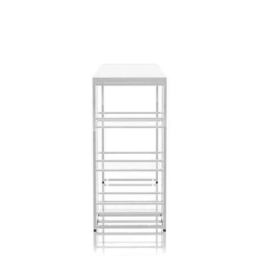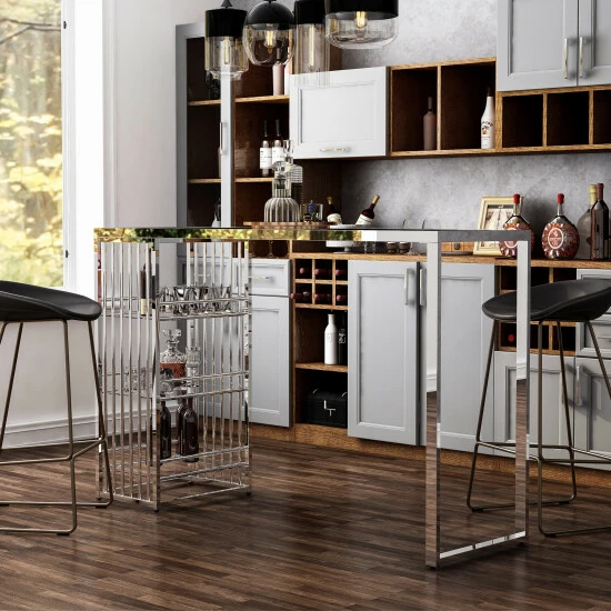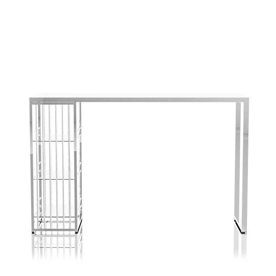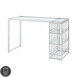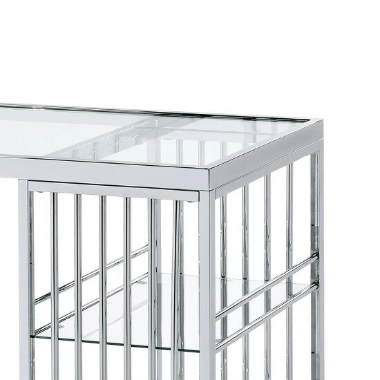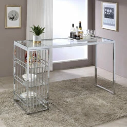 A versatile design highlights the impressive style and functionality of this contemporary bar table. Boasting a rectangular silhouette, the table features a long, clear tempered glass tabletop perfect for everything from display to mixing cocktails. One side of the table features three lower shelves that create a spot for bottles, glassware and accessories. Caged accents decorate the lower shelves while a gleaming chrome plated finish adds metallic appeal.