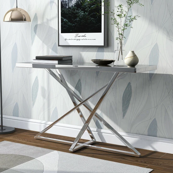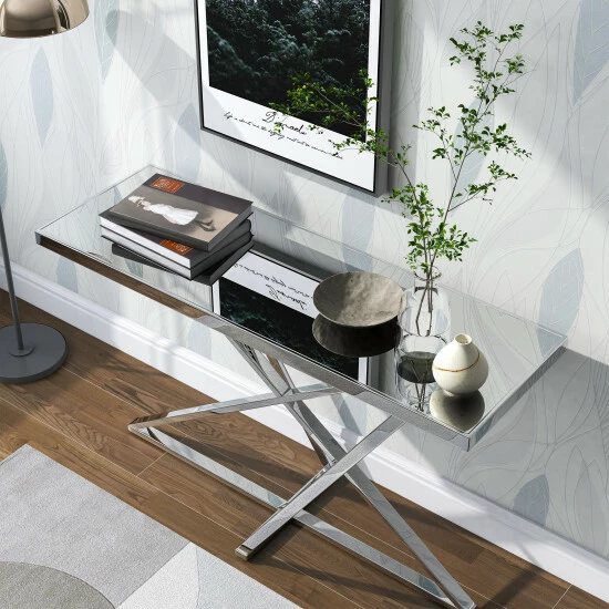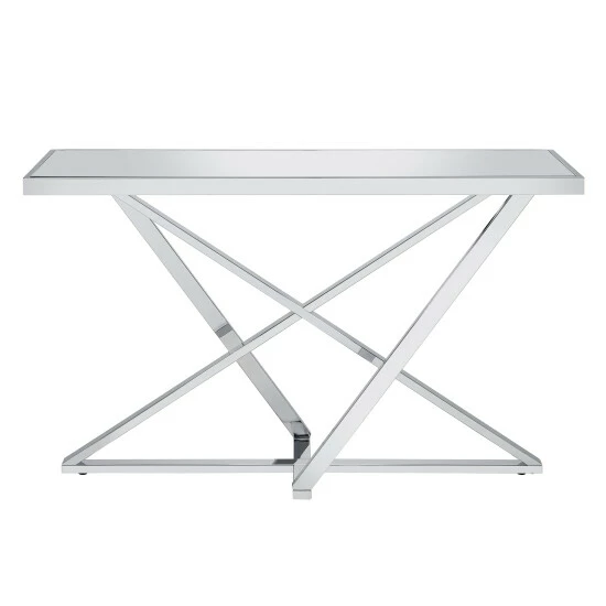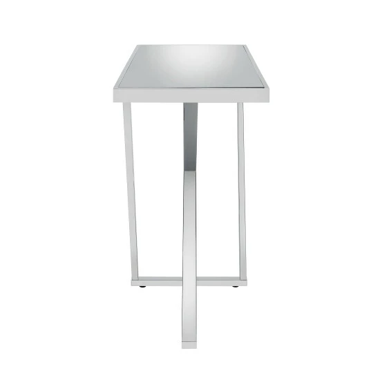 Bring a sense of sleek, glam design to your living room with this cool console table. Crafted in steel with a gleaming chrome finish, the table is complete with a mirrored glass top that’s both beautiful and easy to keep looking its best.