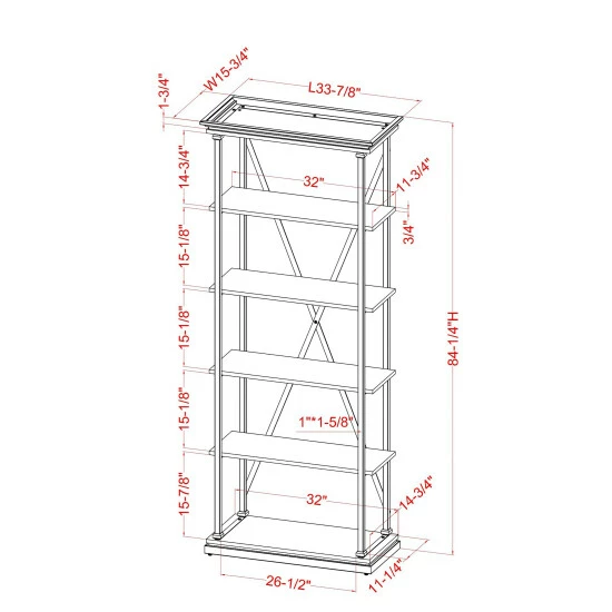 - Overall: 84.25 inches high x 33.88 inches wide x 15.75 inches deep