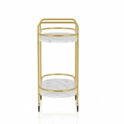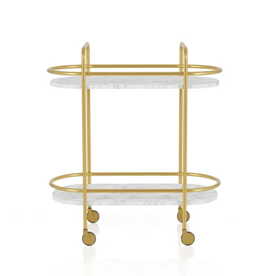 Create your dream home cocktail set-up with this serving cart. A versatile design with glam flair, the cart features a warm gold coating finish with a soft satiny look. Its two shelves each feature a full rail and show off a luxe look with white surfaces. Whether delivering cocktails or serving up snacks and lemonade, this bar car delivers just the right look for your contemporary space.