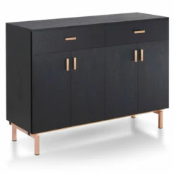 This stunning Mason 47-inch buffet cabinet takes your dining space from drab to fab. With ample capacity for dishes, flatware, and even wine bottles in a five-bottle rack. This contemporary-style buffet table from Furniture of America features a crisp black wood finish over an impeccable streamlined silhouette to complete your dining room’s modern motif. Bar-style metal handles and feet support the buffet and carries up to 5 wine bottles.