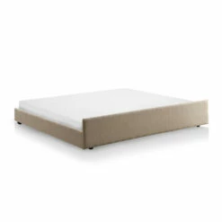 - Linen-like fabric upholstery in a creamy ivory hue