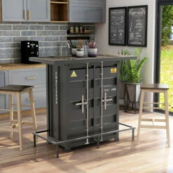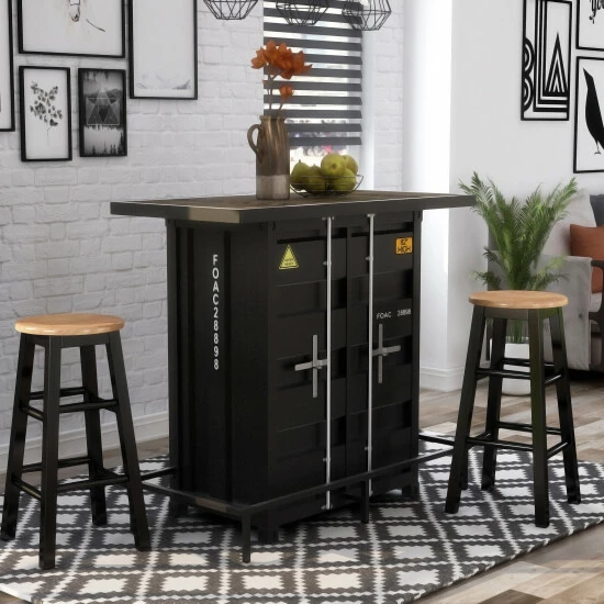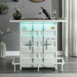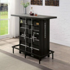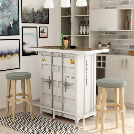 With a mixed material design of steel and a wood-like top, this industrial bar table makes a wonderful addition to a masculine bachelor pad or rustic style home entertainment room. This two-shelf bar table offers ample space for glassware, stemware, and bottles to mix favorite cocktails and more. LED lighting beneath the bartop and faux stickers model numbers lend an extra rugged touch. With a supportive metal foot brace that runs along the bottom, guests can rest on barstools comfortably and securely.
