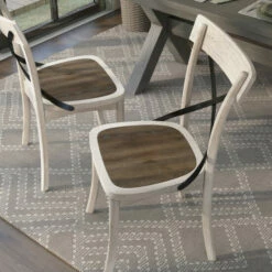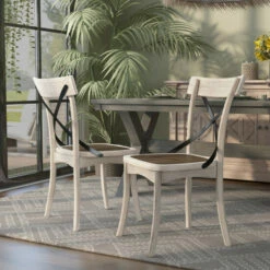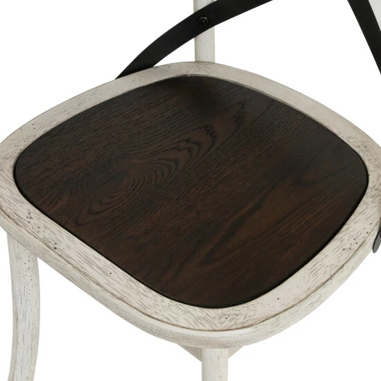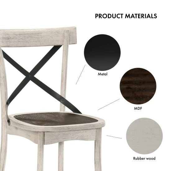These farmhouse-style dining chairs invite rustic charm to your modern home. The antique white frames feature black X-backs, while dark walnut wooden seats add an unexpected touch of brown. These neutral colors with a moody brown tone is a lovely look.