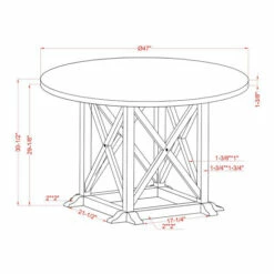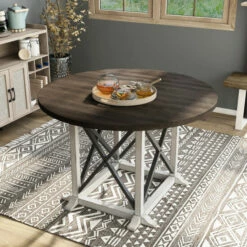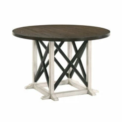 This farmhouse-style round dining table invites rustic charm to your modern home. The antique white frame features black X-accents, while a dark walnut tabletop holds sophistication. These neutral colors touched by a moody brown tone is a balanced look.