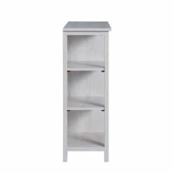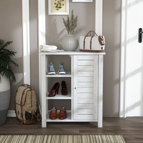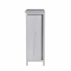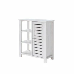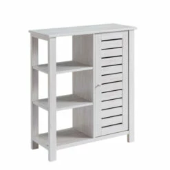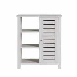 Organize the bathroom with fresh towels and replenishing toiletries. This modern farmhouse-style storage cabinet is a delightful white oak finish that does just that. Three open shelves offer convenient access while the shutter door presents two shelves for soaps, lotions, clean towels, and toilet paper.