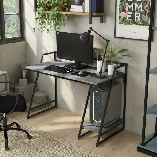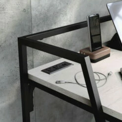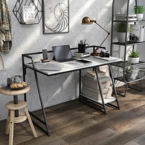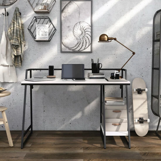 This industrial 1-shelf writing desk from Furniture of America combines an edgy flair with modern conveniences. The steel frame is layered in a classic matte black finish that goes well with any décor, while the tabletop comes in your choice of antique white or light grey and is highlighted by subtle rustic accents. Conveniences include an open side bottom shelf and a handy power strip directly on the desktop. This desk has the style and substance to help you get your work or studies done with ease in your bedroom or home office.