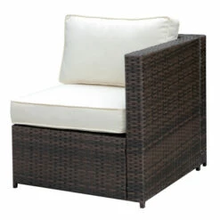 This lovely faux rattan wicker patio seating set is beautifully designed to give you endless customized options for outdoor entertaining. The modular pieces include two armchairs, three armless chairs, and one corner chair. Seating pieces have durable polyester canvas with welted trim on box edge cushions and each table is topped in 5mm clear tempered glass. The set is UV and water resistant with a durable faux rattan wicker and aluminum frame.