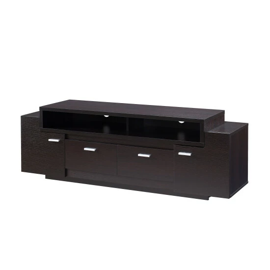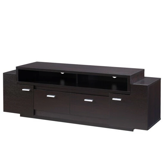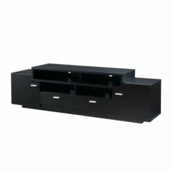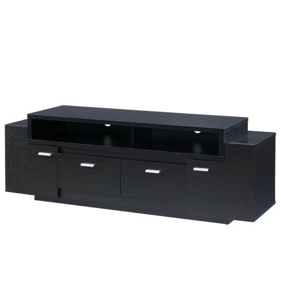 Display your TV and keep media players and game consoles organized in style with this TV stand. The sturdy TV stand features a tiered design with two drawers and a cabinet on either side for plenty of storage space. The shelf is available in two different sizes and colors to best fit your space.