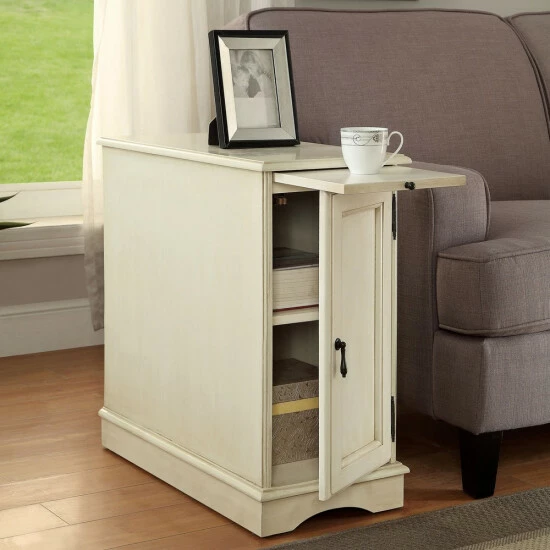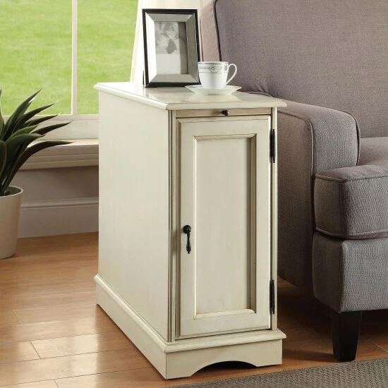 The Merra transitional storage side table from Furniture of America solves storage issues as it stylizes a casual space. With a narrow build and tasteful design, it’s a perfect complement to sofas, chairs, and even bedside spaces. Solid wood and veneer construction fashions a table with space-saving benefits and a sleek, attractive aesthetic. Enjoy a bracket base and recessed cabinet door front, as a pull-out top tray makes room for holding beverages and snacks or incidentals. Interior shelving makes room for essential hidden storage, and ornate metal hardware adds a classic vintage feel. Country charm blends with tasteful transitional design to turn this table into a primary focus in any space.