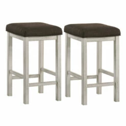 The ultimate in farmhouse charm, perfect for a compact space, this set of two counter height stools are a versatile addition. They boast backless silhouettes and clean, straight frames, all in an antique white finish paired with contrasting dark brown fabric.