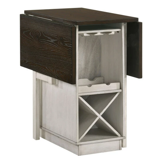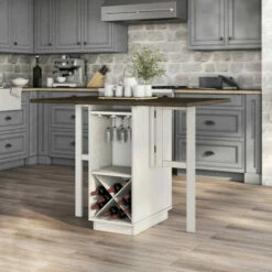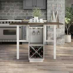 The ultimate in versatility, perfect for a compact space, this counter height dining table includes a drop-leaf design and interior storage. With stemware and wine bottle racks in the table base, this ingenious design keeps favored vintages close at hand.