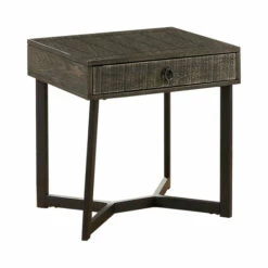 Pull together a rustic, industrial-style aesthetic in a casual family room or living room with this two-piece table set from Furniture of America. The Mini accent table set impresses with a farmhouse feel dressed up with the dramatic ambiance of industrial era design. Solid wood and wood veneer joins metal to fashion an eye-pleasing collection of tables that embellish a seating ensemble. Beginning with espresso finish metal bases shaped in an angular fashion, this set offers a stylish display. Cabinet tops with functional drawers create space for storage as they deliver a cool wire-brushed two-tone dark oak finish. Make any living space a carefree place to relax with this set, which includes a rectangular coffee table and a square end table.