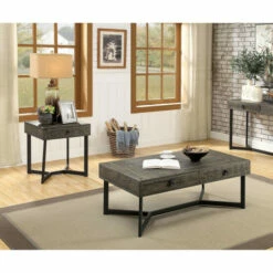 Pull together a rustic, industrial-style aesthetic in a casual family room or living room with this two-piece table set from Furniture of America. The Mini accent table set impresses with a farmhouse feel dressed up with the dramatic ambiance of industrial era design. Solid wood and wood veneer joins metal to fashion an eye-pleasing collection of tables that embellish a seating ensemble. Beginning with espresso finish metal bases shaped in an angular fashion, this set offers a stylish display. Cabinet tops with functional drawers create space for storage as they deliver a cool wire-brushed two-tone dark oak finish. Make any living space a carefree place to relax with this set, which includes a rectangular coffee table and a square end table.