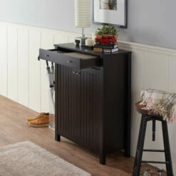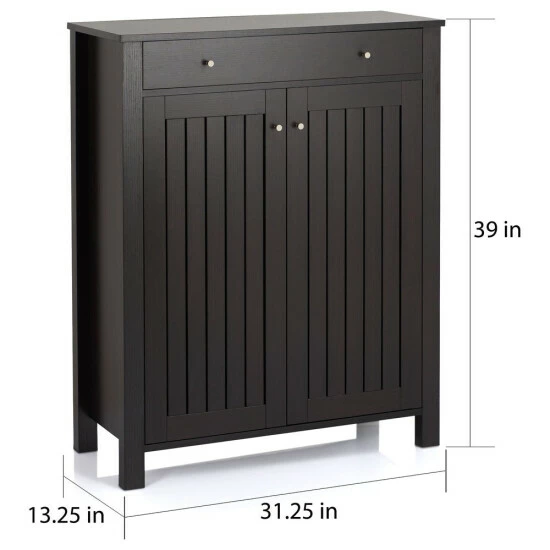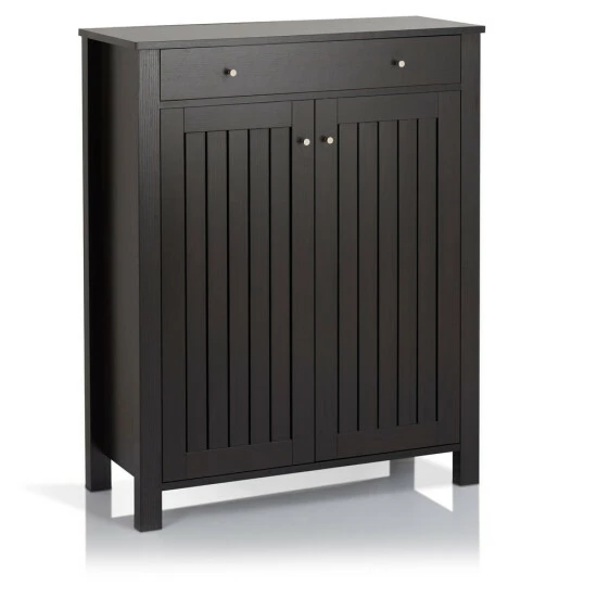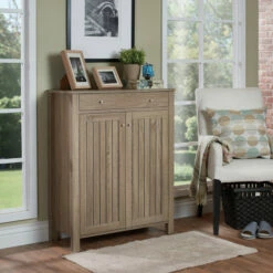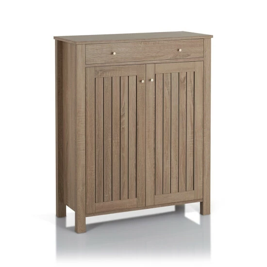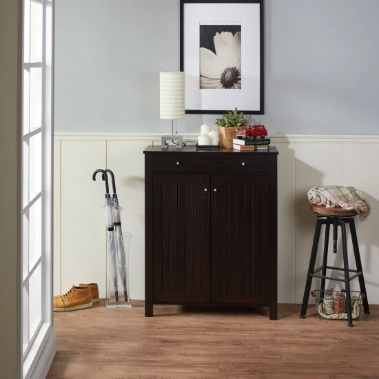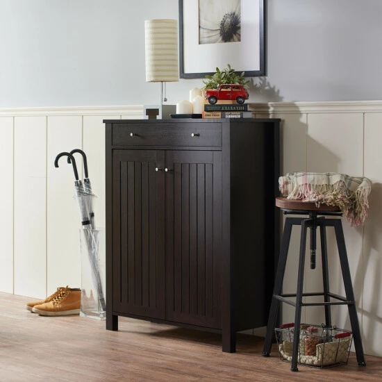 For a more refined storage solution option, this classy shoe cabinet from the Furniture of America Mirille collection lends a Mission style vibe with a minimalist style and bead panel-like, slatted cabinet fronts. Store shoes inside its spacious two-door cabinet, with four adjustable shelves to organize anything from boots to slippers. In addition, there is also a spacious yet slim top drawer for trinkets and accessories, adorned with two understated round metal pulls and mounted on a smooth metal glide. This shoe cabinet is available in either a cappuccino or light oak wood finish to work with existing furniture pieces and decor. The perfect place for shoes and other accessories, this cabinet will grace your entryway with style and convenience.