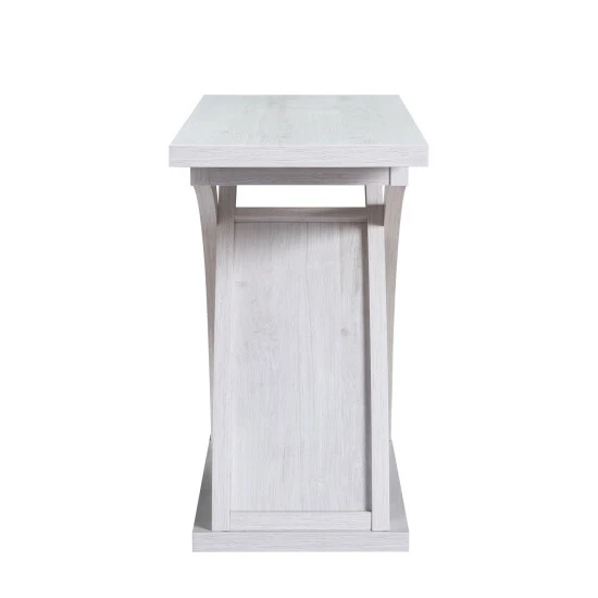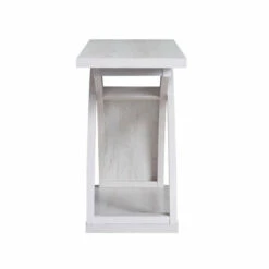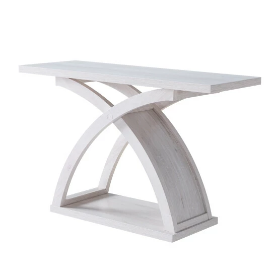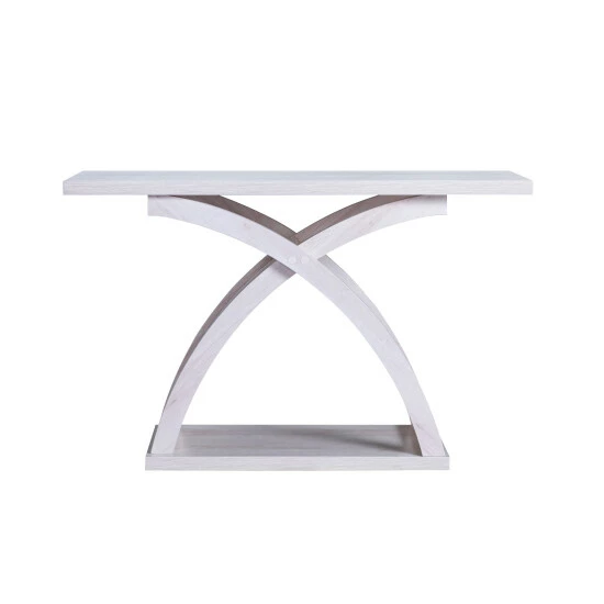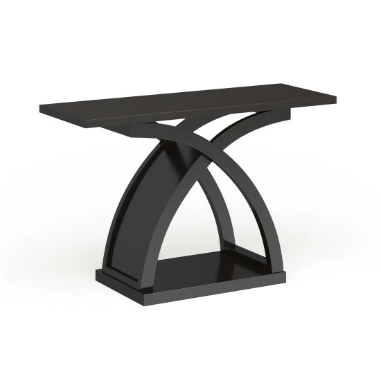 Add a decorative look to your home with this contemporary wood 1-shelf sofa table. Embrace the dramatic look of a deep espresso finish over solid wood with wood veneer accents. Perfect for any entertaining space, this sofa table offers a whimsical X-shaped base silhouette joining a paneled side with an open side. A lower shelf expands space for storage and display.