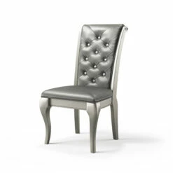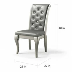 Elevate and stylize your dining room with the grey faux leather upholstery and button-tufted backs of these transitional chairs. With solid wood frames and foam-filled cushions, this delightful champagne-finished set provides sturdy support and luxe comfort. Faux crystal accents offer the perfect pop of sparkle.