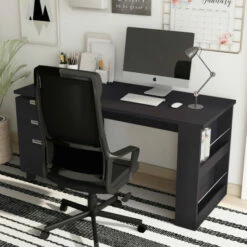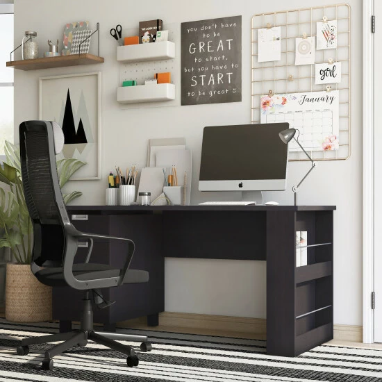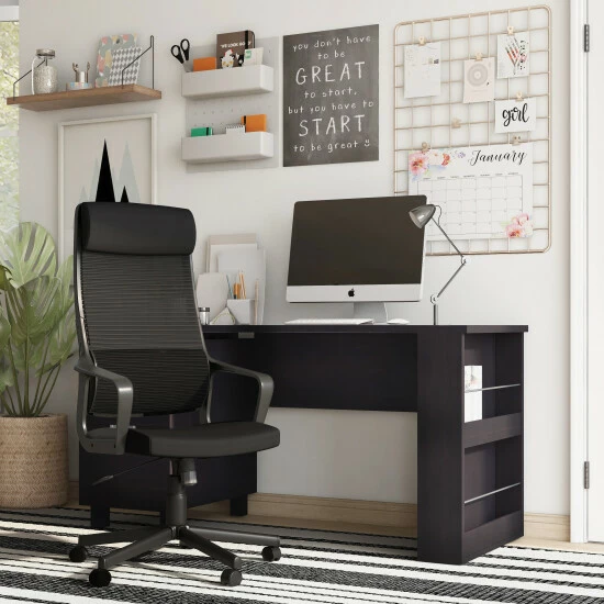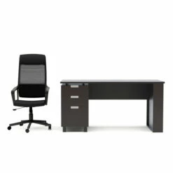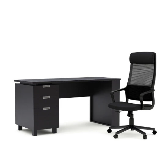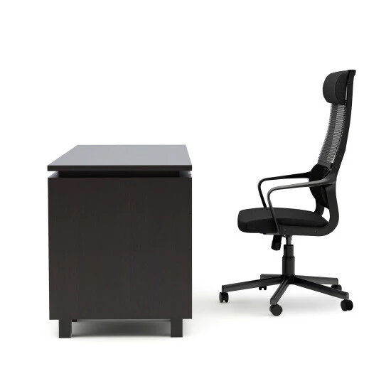 Establish your professionalism with this home office set. The espresso office desk is a versatile workstation with a built-in file cabinet and magazine racks. Work on the ergonomic black chair with adjustable lumbar support and headrest.
