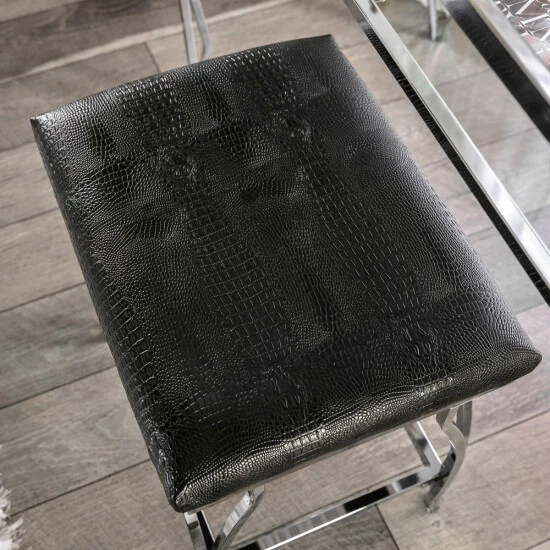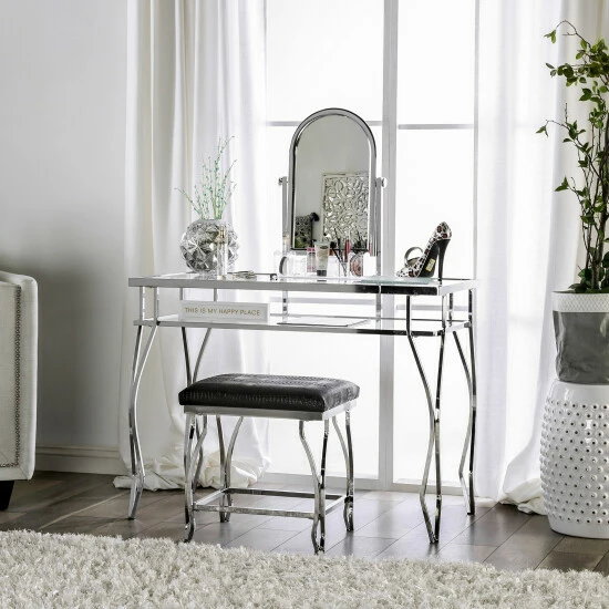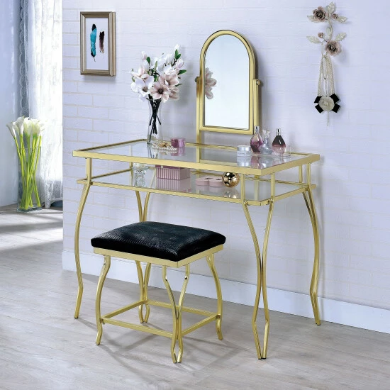 Get a jump on your day with the Mowe glam design of this modern metal vanity set from Furniture of America, which features a table, stool, and matching mirror. The set comes fashioned completely in metal in your choice of a gold or chrome finish, with the table featuring a sleek frame, tempered-glass tabletop, and contoured sturdy legs. The gleaming table also features a matching arched adjustable mirror and a spacious glass shelf for storage. The set also includes a two-tone metal stool with a plush, faux leather cushioned seat that makes getting ready comfy and convenient. This chic modern set will add a glam dimension to your bedroom or walk-in closet.