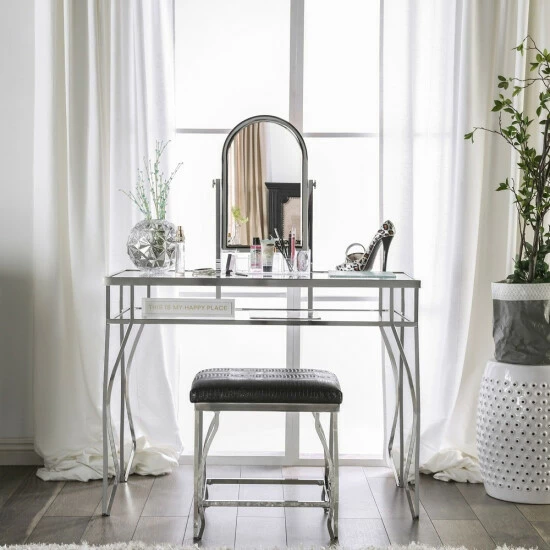 - Includes 1 vanity table, 1 mirror, 1 stool