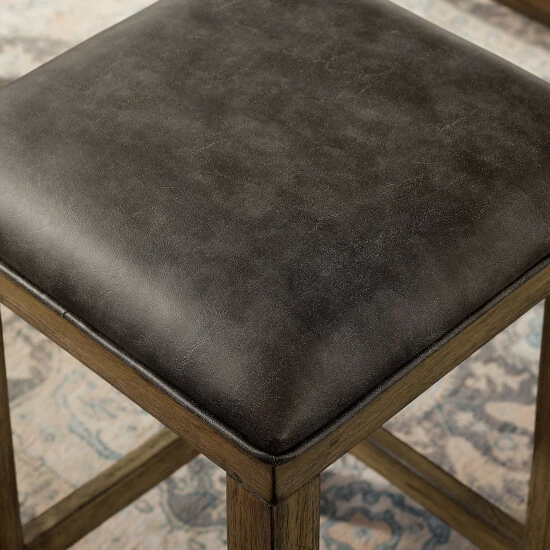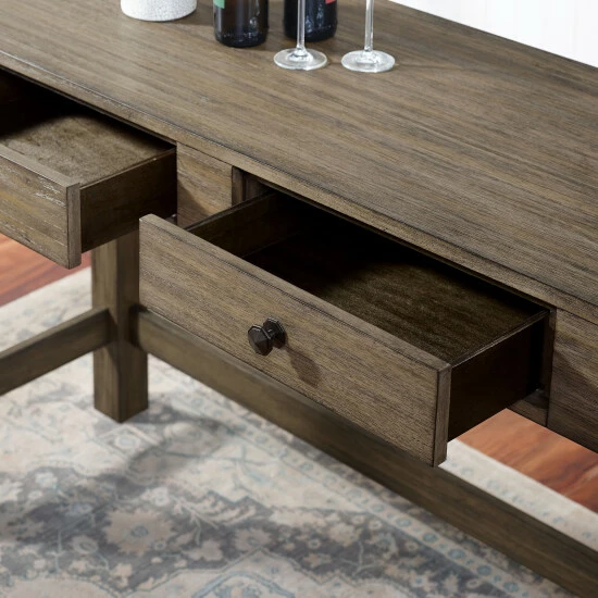 With a sleek, clean profile and casual charm, the Naht transitional three-piece counter dining table set is a hit in any compact space. A minimalist design features solid wood and wood veneer construction with a versatile walnut finish. Store essentials in two drawers at the base of its rectangular tabletop that features cutout rectangles at each end. Two built-in USB ports and two power outlets allow charging and operating of electronic devices, adding exceptional convenience. Matching bar stools mirror the table’s clean design, providing casual, comfy seating on padded seats wrapped in grey faux leather upholstery. Choose this set of one table and two bar stools to set up an informal space for easy entertaining.
