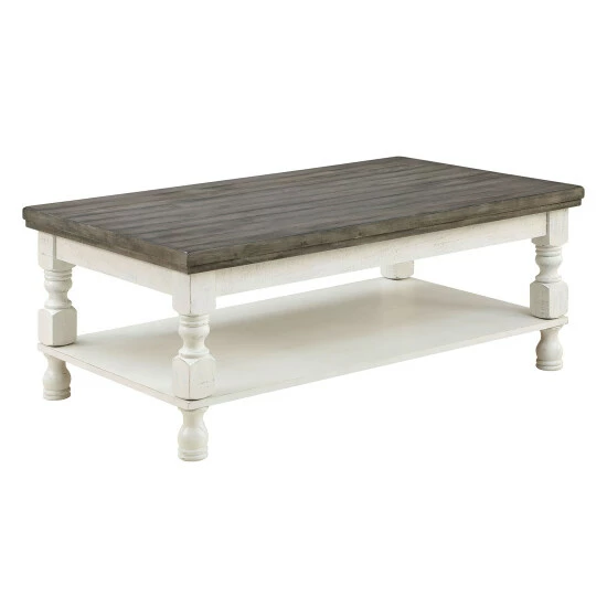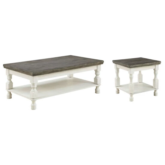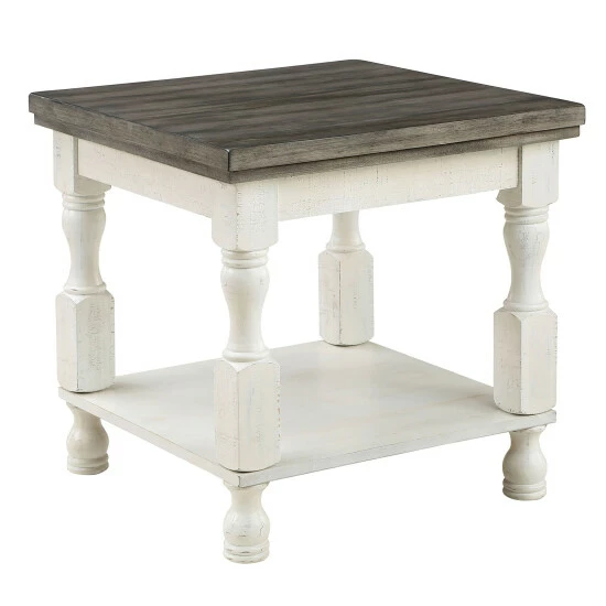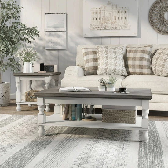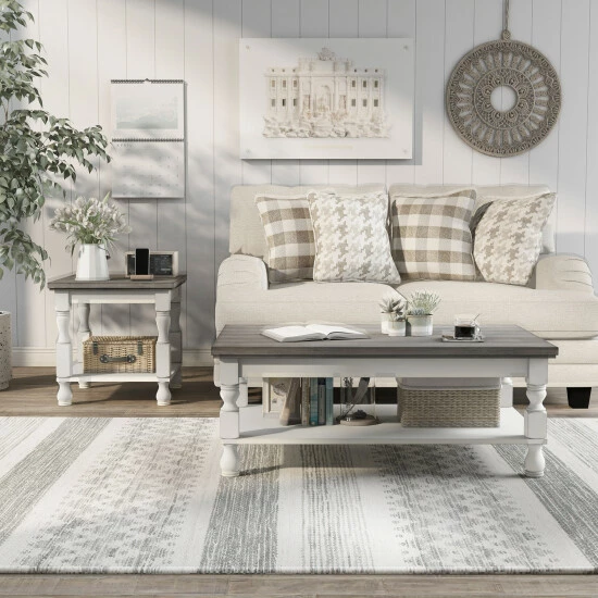 Reinvent your inviting living space with the modern farmhouse character of this set of two living room tables. Perfect for a welcoming ambiance, the set pairs antique white finish bases with gray wood grain tabletops for a crisp, casual look.