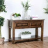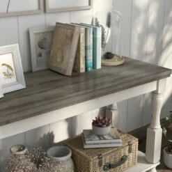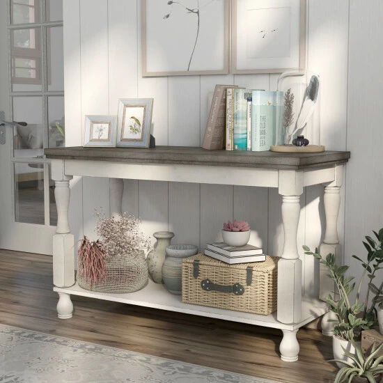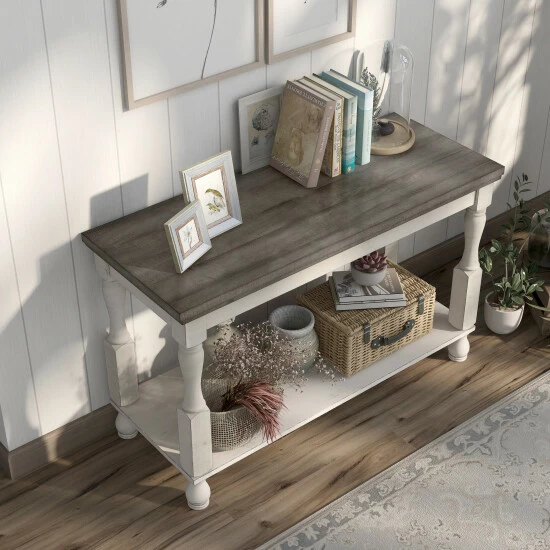 Bold two-tone design brings modern farmhouse energy to this charming rustic console table in antique white with a grey tabletop. Its turned legs bring a sizable dose of character while an open lower shelf adds a place for decor, books, or storage.