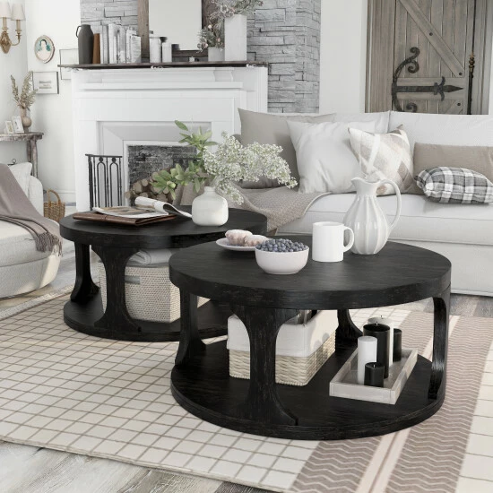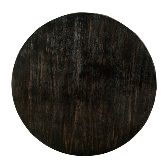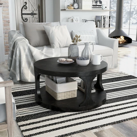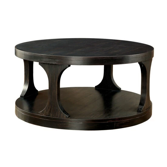 Embolden your rustic living area with the round Nela coffee table from Furniture of America. The antique black wood frame is detailed with curved column legs and subtle woodgrain texture. The open bottom shelf and tabletop offer room for decor, books, and media accessories.