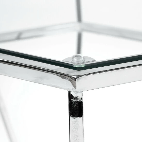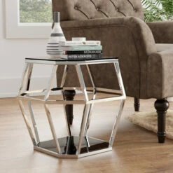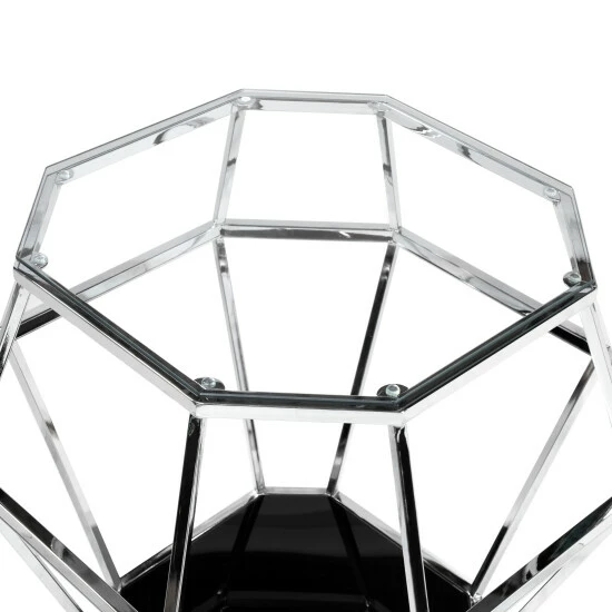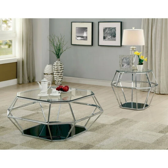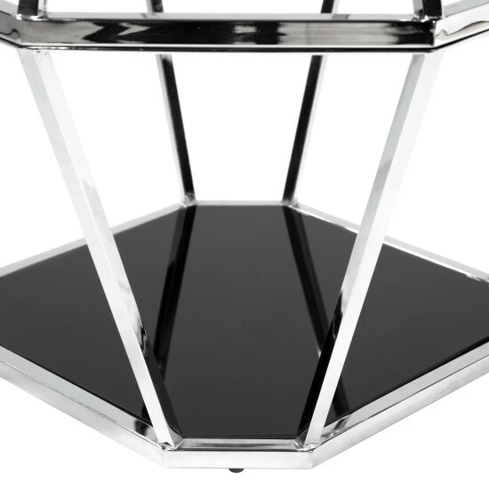 A unique hexagonal structure defined by angular lines and a sleek chrome finish, this end table is expertly crafted by Furniture of America for the Nese collection. It’s the epitome of modern design, bursting with plenty of contemporary elements to add a hint of glam and luxury to your living space. The open base features a black glass bottom and clear glass top for a hint of color and shine. Tempered glass enhances the safety element of this piece while its chrome base creates an interesting highlight. Made from metal and glass, place this contemporary end table strategically in your living area.