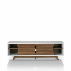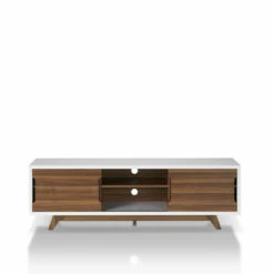 Display your TV in mid-century style with the Neva TV stand from Furniture of America. The modern white frame features six adjustable shelves for media storage and a wide tabletop for large flat panel TVs. Two sliding walnut-finished doors offer concealed storage, and is paired with a white crisp frame that offers a touch of shine. Constructed of durable particle board and wood veneers, this is an incredible option for a modern and contemporary TV stand in your living space. The lovely light walnut finish is bound to enhance your decor while providing exceptional storage options for your media space.