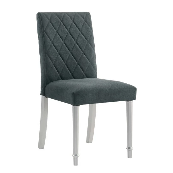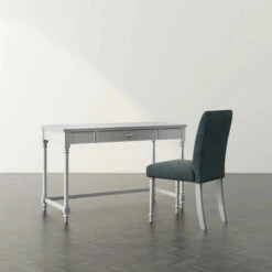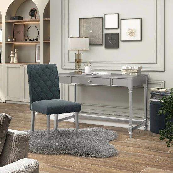 Create the workstation of your dreams with this glam writing desk and chair set. In gleaming silver finish paired with quilted grey upholstery, the set offers storage in one drawer and a look that works anywhere in your home.